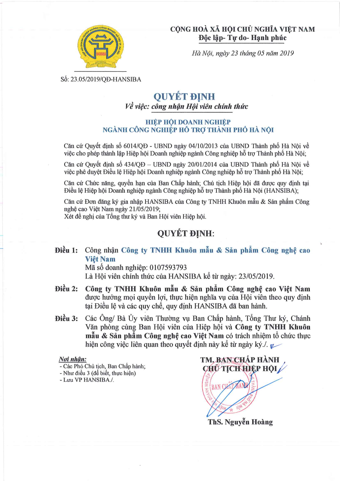 Kể từ ngày 23/05/2019 Công ty TNHH Khuôn mẫu & Sản phẩm Công nghệ cao Việt Nam là hội viên chính thức của HANSIBA
